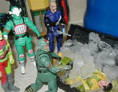 I've wanted this figure ever since first seeing the grey casted prototype up on Yo Joe and wanted it even more when the painted prototype surfaced. Even if I were to cross paths with this extremely rare piece I doubt I'd be able to come up with the several hundreds of dollars the price tag would demand. So, I customized my own by dyeing the parts black to preserve playability. I was going to use the Hydro-Viper webbed hand, but found the Predator hand to have a more menacing texture and claws. The actual figure has a pouch on its right thigh. To duplicate that I used the Chap Mei syringe pouch because I figure he still needs to keep the infection away and keep the Mega-Monster mutation from spreading.
