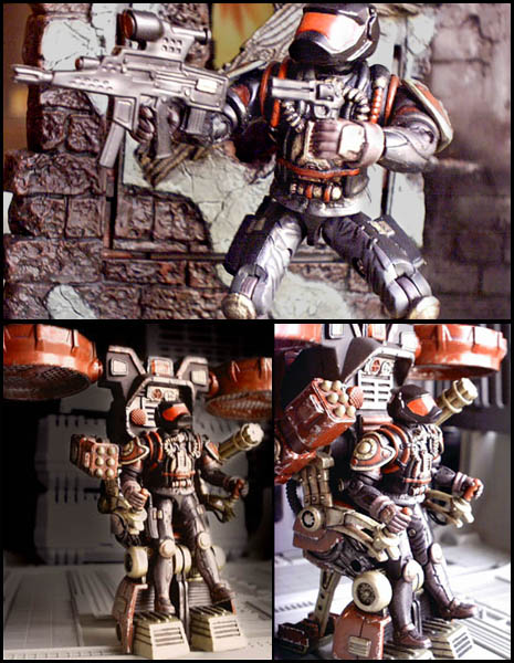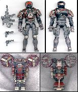 A straightforward repaint of the figure has a lot to offer, but when I was thinking how I might replace the original backpack with something more substantial, I decided to put everything aside except the distinctive helmet. With its braided cords and decorative belt buckle, the original Annihilator had a pleasing ceremonial look, great for a dress uniform, but a poor choice for a soldier in the field. To correct some of those missteps, I wanted to provide the Annihilator with an oxygen source during flight and light armor for protection. I also wanted to keep the twin leg holsters found on the original, but make them functional and more aesthetically pleasing. The result is a mix of parts that combine the look of a Navy SEAL with the high-tech flourishes of the Iron Grenadiers. More than just an airborne trooper, I see this version of the Annihilator as a soldier who is effective in multiple environments with a mobile air platform as one means of transport rather than a specialty unto itself.