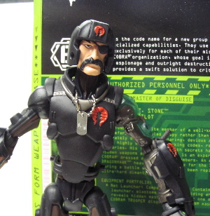 I made Major Bludd because I have the skills to do so. I had to repaint this guy brown and give him a porn star mustache. Who do they think they are fooling with that Lt. Stone figure? I had to cut the visor off of the helmet so you could see that he is missing his eye. Why would a master of disguise be a one-eyed person? Do the people at Hasbro think these things through? So once again I will take the weight of the company on my shoulders and make the figures they should be making. Lt. Stone??? Wow. SIGMA-SIX!!!
