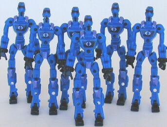 Following the generally successful test of the B.A.T. v.7 prototype, the unit was turned over to Techno-Master for refinement prior to mass production. Techno-Master completely redesigned the head, giving this latest Battle Android Trooper stereoscopic vision, essentially allowing the unit to "see" in three dimensions, far better than any previous B.A.T. He upgraded the targeting system, and recommended alternate construction materials that would make the B.A.T. lighter in weight, but just as durable as before, allowing the B.A.T. v.7.1 units greater speed and agility. Aesthetically, he changed the color scheme to an almost total "Cobra Blue", with a few metallic highlights. In a sense, this allows the B.A.T. to make an unquestioned statement about its allegiance, and as such, its intentions - destruction and mayhem on an inhuman scale. When you consider that this latest B.A.T. can attach weapons to multiple points along its frame, that "scale" takes on some truly frightening implications. Any one of these things is capable of a level of firepower that would require five or six people to accomplish. It doesn't help that they also incorporate a modular design similar to the B.A.T. v.5 and can trade off damaged parts for better ones right on the battlefield.
