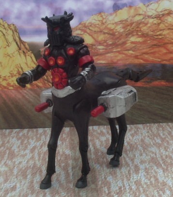 I thought long and hard about what to use for the main body of the horse, and finally settled on the Centaur from the harry Potter figures on sale over here in England. The torso pops away from the horse quite easily, and only a small amount of filler was needed. I debated whether or not to add the side cannons, but I finally went with my initial idea and used the missile launchers from the SHS range with missiles from a model kit jammed in the end. I used another Cobra Commander figure as I wanted the torso to look exactly like the bipedal version I did.