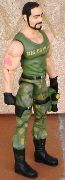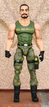 Of course I had to use the v.1 Big Brawler head. If he didn't look like Christopher Lowell, he wouldn't be brawlin'. The "Big Brawler" print across his shirt is a decal. I usually prefer to hand paint my lettering, but I really, really wanted it ot look like stencil. I applied it with Duco rubber cement on the back (it's crystal clear and doesn't discolor) and sprayed it with a flat sealant after it dried. I tried to stay as faithful to the v.1 Brawler as I could, but I did make the decision to leave his shirt a tank top, if only to show off his pink triangle tattoo.