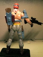 The stomach was dremeled and sculpted for abs. The hair, headband, bandana, boots and belt were sculpted from all-crafts epoxy. The gun and backpack (straps from other packs) are from the original 80s Zandar. The holster was cut off Joe Colton (Viper's Pit).