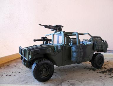 I originally wanted to do a GI Joe remake of a British SAS Timber Wolf for my 21st Century Joe line, but could not find a 1:18 scale Land Rover Defender. I think the Humvee makes a decent substitute. I had to paint the whole thing dark green though with black to mimic the original British camo scheme. I am really pleased with the way this came out and it looks quite modern and realistic.