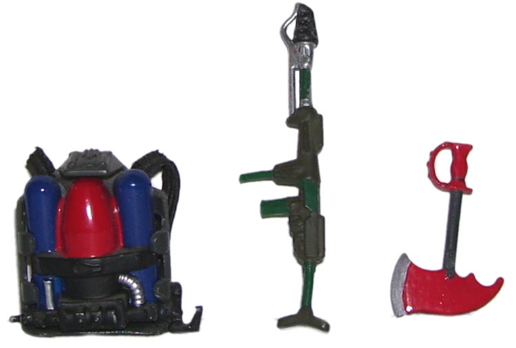 Accessories: Heavy Duty V6 bandana tails , Blowtorch V1 (accessory pack) flamethrower, Barbecue V2 backpack and axe, miscellaneous black hose.