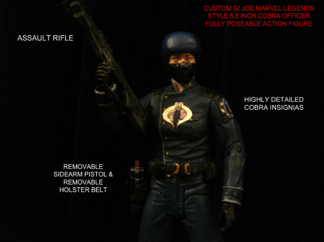 A DandDCustoms G.I. Joe custom marvel legends style 6.5 inch cobra officer fully pose-able action figure. Some dremel work and Sculpting and painting. We made this one a female to mix things up a bit. We also wanted her to look more like an officer who gives orders rather than the cobra soldiers who take them. Special attention was given to the cobra insignias to make them look professionally done. She is scaled to work with the other marvel legend action figures.