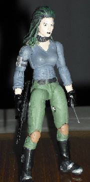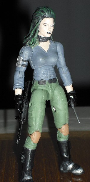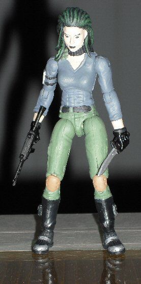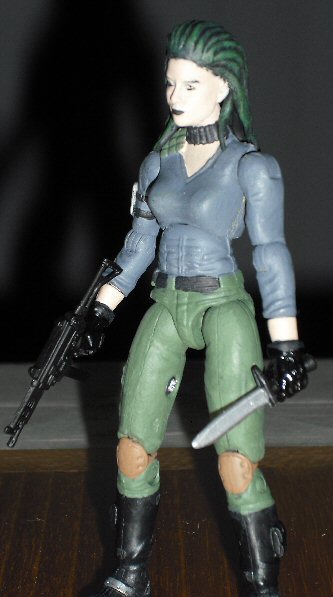 Zanya is Zartan's daughter and heir to the Dreadnoks. That's about what I know. I thought the Dreadnoks needed more women so I gave Zanya a go. Her dreads are made entirely from scratch, sculpted from green stuff. Getting the arms and torso to work together was the hardest part of this custom. I had to both widen the arm holes in the torso as well as shave down the upper arm pegs. All in all I'm quite satisfied with my finished product.