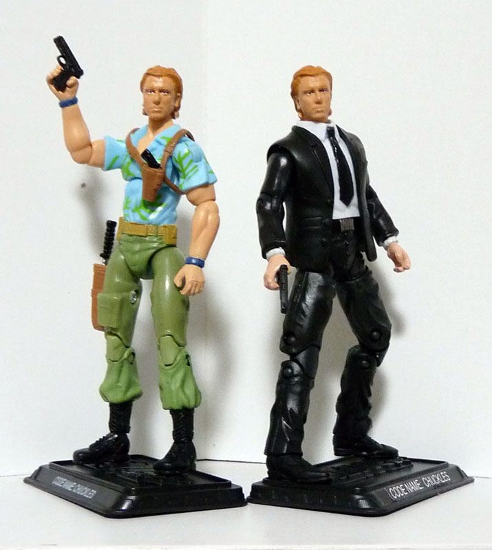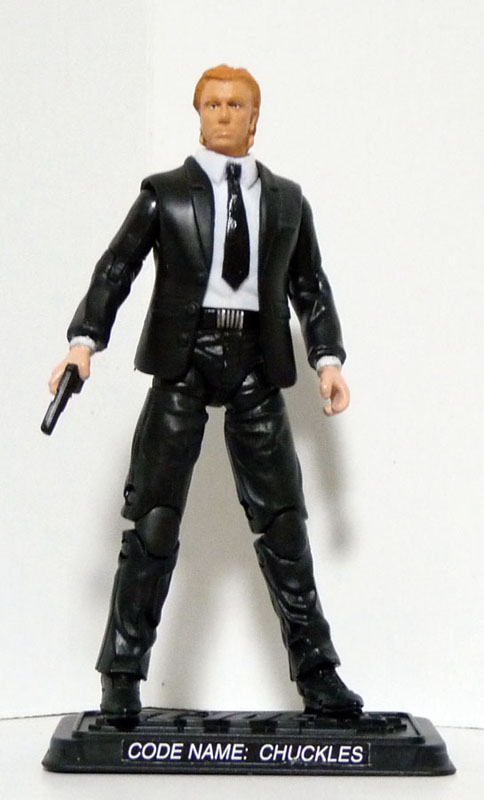 I figure even a guy as versatile as Chuckles couldn't be very effective undercover if he was always wearing the same Hawaiian shirt and olive drab pants. So I made mine a spare body wearing a pretty standard government issue monkey suit.