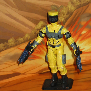 This was my entry for NJC #40: Henchmen! I originally received the parts for this figure (minus the head) from a lot of custom fodder from HypnoHustler -- he had pieced five of these figures together for use as an IRON Army. I used a cast of another AIM Scientist (from JFAK075, based on a neckball surgery from an old Visionaries toy), sanded off the facial features, and added the screen and border to the face. I then attempted to paint yellow, and that's where the wheels fell off this custom, and stopped me from making any more of these characters!
