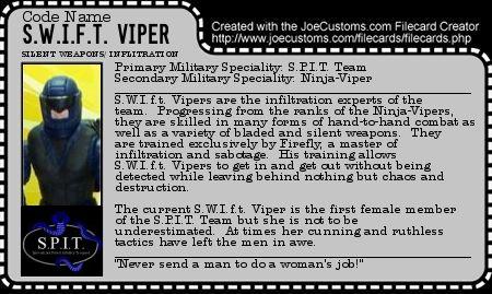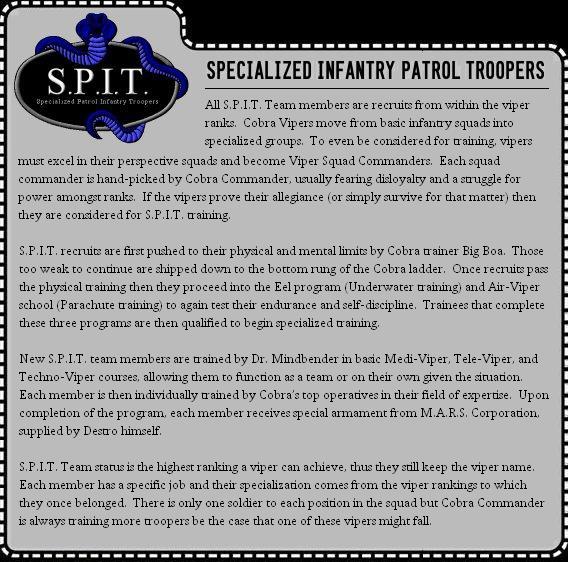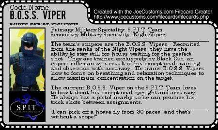 Head: Flak Viper 92 Arms: Ace 83 Torso: Gears 94 Waist: Ace 83 Thighs: Cobra Commander 87 Feet: Cobra Commander 87 Gun- Cobra Commander 93 Backpack- Dial-tone 86