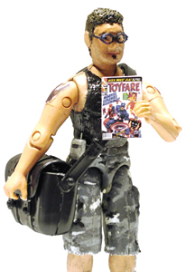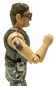 I started piecing together my body going with what I normally wear, my torn raggedy camo shorts. I had to add Sculpey to the bottom of them to give it the ragged look. I Sculpeyed my back pocket to match my torn one. Add on the wallet chain and Sculpey cell with metal antenna. I then found the Cage legs since no other legs were bare and had tennis shoes so I had to sculpt them on. I had an old 80s Remco figure that I originally was going to use the torso and arms, but I just wasn't pleased with the look of them, so I ended up just using the skinnier arms. I popped the armor off of Rapid Fire and used his chest. I sanded down the girth of it some and made my Sculpey wife beater on it. I was searching for a head that came close to resembling me, when I couldn't find a Space Shot, I found a newere Corps! figure head.