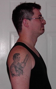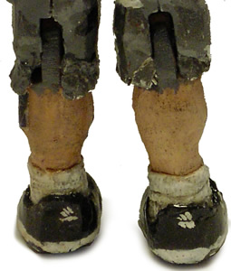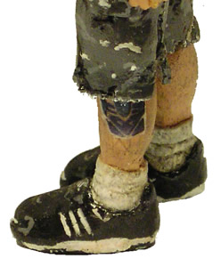I started sanding down the hair and all, and just went haywire and took most of the face/hair off. I Sculpeyed everything on there except the eyes and mouth. I dremeled down the Baroness glasses to resemble mine. I took pics of my tatts and shrunk them down to size on sticker paper, cut them out and glued to the parts. On this project I used the Flex Sculpey for the first time. I would say I am about 75% pleased with it. I had the damndest time creating the shoes because it wouldn't bend around the bottom of my feet causing it to crack. That and I had major issues with it and paint. I even bought the brush on finish that helps adhere paint, but it still came out tacky.... :/