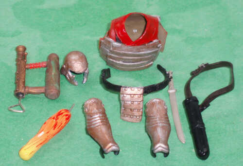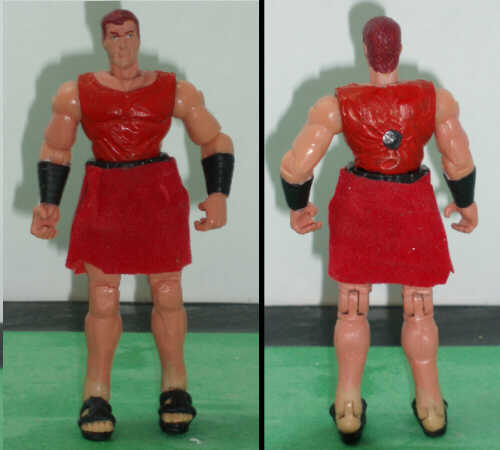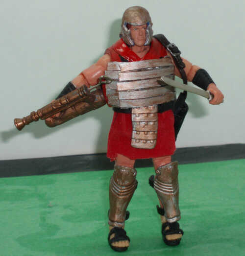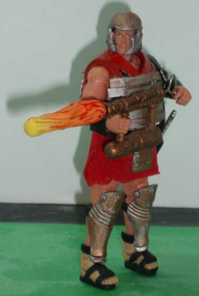 The focus for Blowtorch was on his accessories.This was my first real exploration into using strip styrene, which I think lent a lot to the banded mail. And it was just luck that I had a soft plastic VvV Viper helmet, which needed only minor modification to become the Roman analogue. His 'blowtorch' looks very much like the one theorized on the program: it's pump action, like a super-soaker, with the naphtha reservoir in the bottom tube. Pump back, the change in pressure pulls the fuel to the top tube. Pump forward, the naphtha sprays out the end and ignites. The show's reproduction, using only the materials the ancient Greeks would have had, launched a stream of flame over 20 feet!