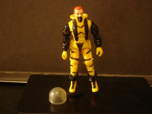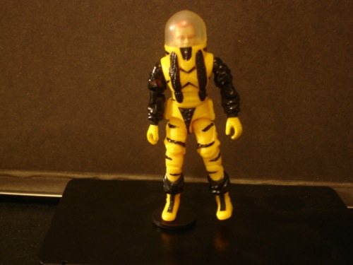 Deep Six's response to a question from a fellow Joe diver: Why am I wearing a Cobra Diver suit? Because Cobra has always had highly advanced Dive gear and submersible equipment. Look at the Bugg and the Hammerhead, we can't compete with those. Cobra, being a covert terrorist organization has always found that hiding under the water is an extremely efficient way of operating without detection, and has invested great expense into perfecting deep sea technology in their bases, subs, and dive gear. Now I am not saying that our dive technology is bad, it's not, it's good. It's just that theirs is really good. After the Cobra Civil War and the invasion, I requested permission from Hawk to conduct salvage operations where whathisname, the stealth pilot dude (I never can remember his name), sunk a couple of Cobra Buggs on his run into the Island. We were able to bring back a lot of the wreckage from almost one and a half Buggs, and have been able to reverse engineered it quite a bit. While you will never see a Bugg with tiger stripes on it, there was enough left to put together a functioning suit. This thing is awesome, super flexible, not cumbersome, almost perfectly neutrally buoyant in the water, well insulated, has a HUD projection on the faceplate and highly efficient air scrubbers that are so good we think they were used on their Space Shuttle.