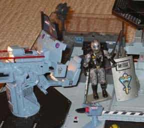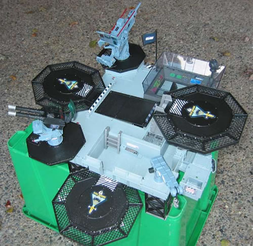 This playset is based upon the Hasbro TTBP, with two extra landing pads: one 'fixed' near the crane (with access cut in) and one attached to the sliding drawbridge. The Jet Pack is nothing more than the Cobra flight pod thrusters epoxied (JB Weld) to the Silver Mirage Back Shield. The JUMP platform and control station are also epoxied to the base. There is a piece of the Cobra Surveillance Port epoxied to the back as a landing pad for the SB Hovercraft (salvaged from a Havoc). There are also various & sundry pieces scavenged from the missle, machine gun, ammo dump, and other small playsets to make up the different ammo boxes, gasoline drums and cans, missle launchers, missles, and boxes. My favorite part of this playset is the utilization of the FLAK Cannon in place of the platform missle launcher. I actually took this idea from an auction i saw on eBay, where the seller had put this gun on the platform, and then mistakenly said the toy was 100% complete! The Skyhawks are of course from MC, but I remade a bunch of the stickers for them, as well as all decals for the base and accessories. As a side note, I finally found a use for the extra Night Force & Anti-Venom figures I had -- just needed to buy up a pile of $1.29 BJ's Exclusive Roadblocks from eBay!