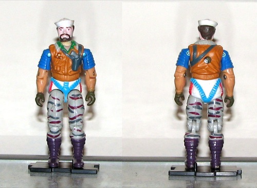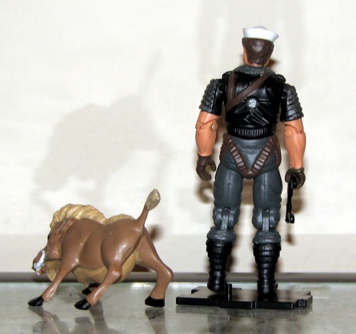 was never the same. But it wasn't until after the final battle between Cobra and G.I. Joe that the full effects of her death finally took its toll. In the post-apocalyptic world following the destruction of most of the free world,Shipwreck was one of the few survivors of the war. Stranded in Australia, where he was assigned during the final battle, he salvaged a Cobra Moray and set sail into the Pacific. Before he left he took aboard a wild boar, originally as a source of food. But each time he was prepared to slaughter the pig the sea would provide him with an alternative food source. Eventually he began to see the pig as a companion, much in the same way as his dear departed Polly was until her untimely death when she was eaten by a wild dingo. Along with Porkchop, Shipwreck sails the seas in search of a peace he hasn't had in many many years.