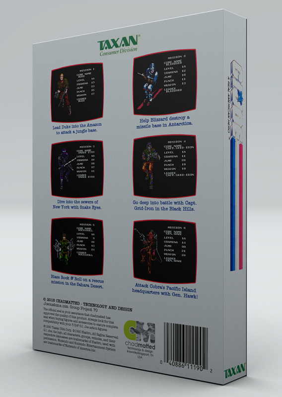 On the back of the box, I changed the in-game screens pictures to show the six playable characters from the game, including text that describes all six missions. I also changed and updated some of the text and logos as well. The inside of the box shows a shot of the ingame picture for each character, and there is an opening to show the actual figure in the packaging with their character descriptions.