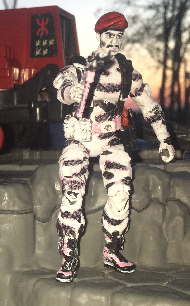 It isn't actually just white. There is a muted pink in there to make the white stand out more. Then the camo and some shade areas aren't just black. They are crossed hatched or fading lines of black. The face not only has shadows but deep furrowed lines. Just some shading, dry brushing, and tight line painting, nothing I haven't done before. It shouldn't have been a problem, but then I sealed it with an ultra matte finish that blurred and cracked the camo splotches. You still get the overall look, but not nearly as crisp as I would have liked.