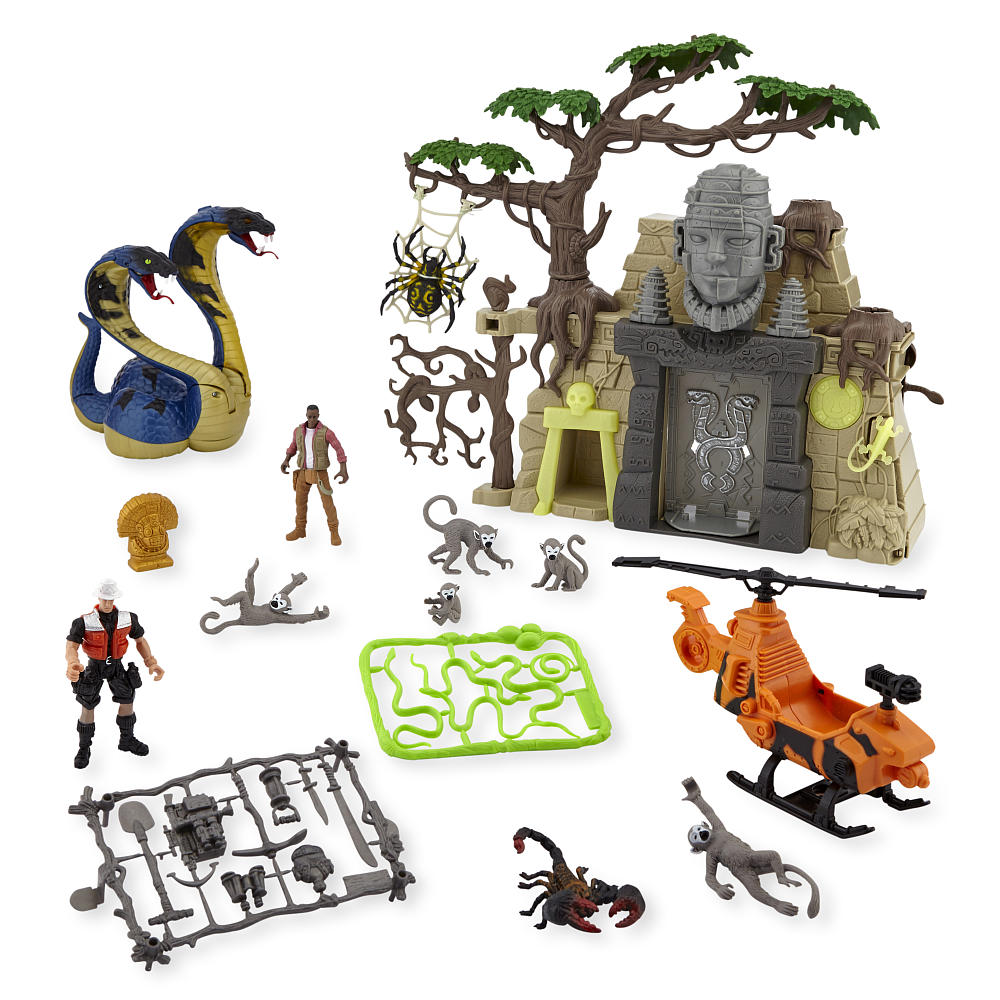 The temple is pretty awesome. The plastic used is a bit flimsy so I wouldn't recommend standing on it. So the temple head is actually a lever that you can push down and it will rotate the door. I think the lizard, seal, and hidden chamber entry are glow in the dark but I have not confirmed that yet. The sculpting is really good and has a lot of details added that are a bit hard to see but will look really great with a little bit of paint. The extra tree stumps are actually functional and the tree can be moved and inserted into any of the other stumps.