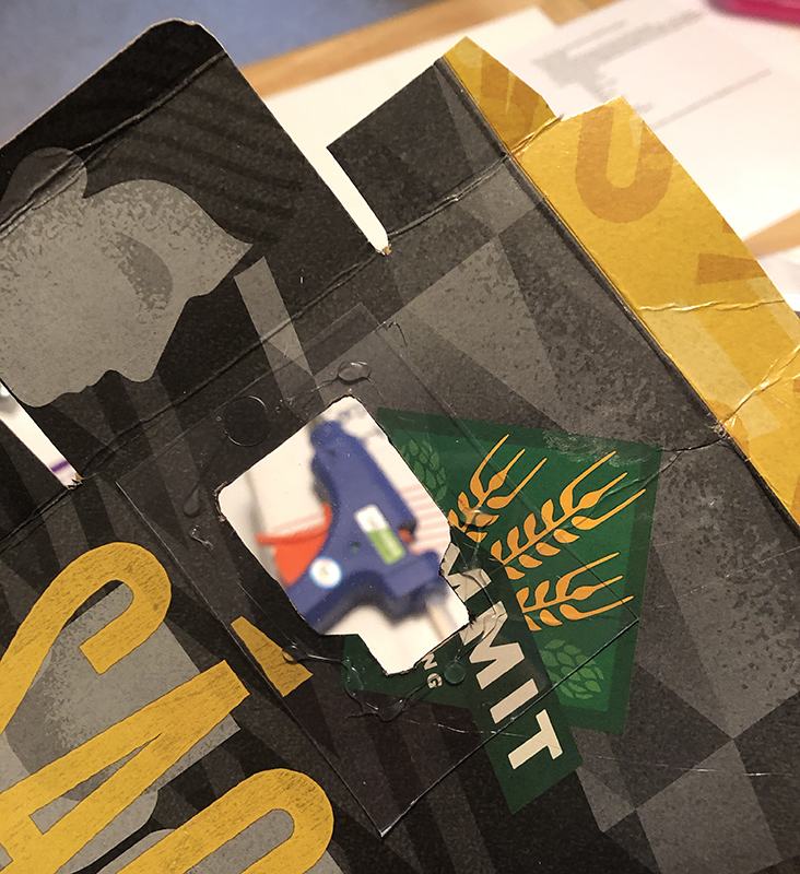 Not shown: taking the BFS Box apart and scanning into computer; a few hours of PhotoShop spread over a handful of days; putting the BFS Box back together with some hot glue. Also should note: this was printed on a full letter-size sheet of sticker paper, which was then applied to thin cardboard (a 12 pack carton - not the best idea, as it had pre-folded creases in it)