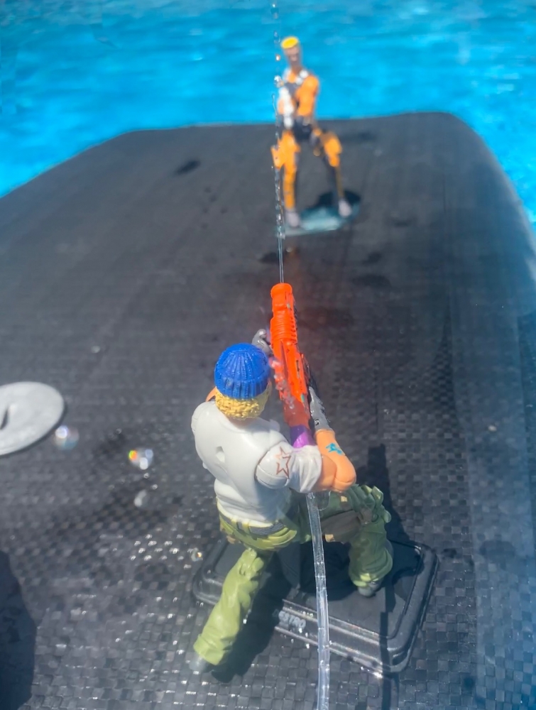 A bit about the photoshoot. I already knew it was going to be hot and that the plastic figures would get all soft during the shoot. What I didn’t know is that it was going to literally be the hottest day of the year here with a heat index of 110 with 90% humidity. My phone kept overheating. Then the ripples of the water kept knocking figures over. Who ever thought it was a good idea to shoot on water on top of a black wake board is an idiot. :shifty: