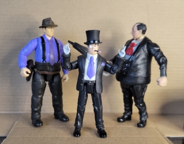 And here's my new Penguin (repainted Multiverse Penguin with a cast movie-likeness head of the character from The Batman and some MU hands/feet) intervening as an LBC Harvey Bullock (the actual Spinmaster movie Penguin with an Indy hat and gunbelt) gets ready to haul my former default Penguin custom (a Speed Racer figure with re-engineered elbow joints, MU Bullseye hands, Multiverse Penguin hat and articulated Joe feet) away to the fodder bin.