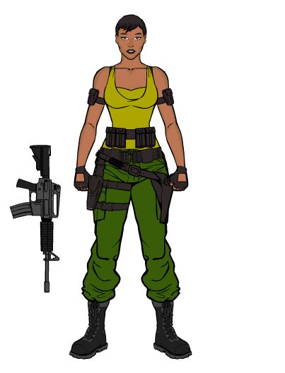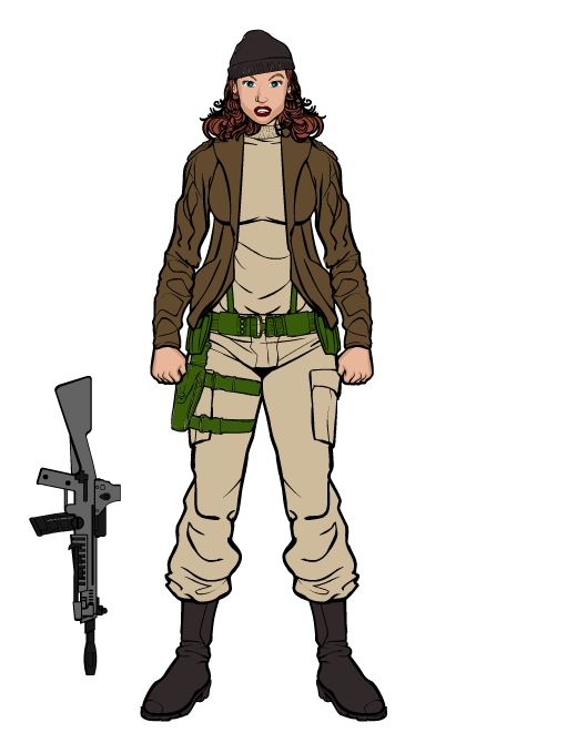 For this one I was thinking HQ defense. The helmet has dual antennas to monitor multiple frequencies and has a targeting sight. I thought with the red shirt, she could be artillery or another specialty that would require exceptional math skills. Wouldn't be a frontline type character.