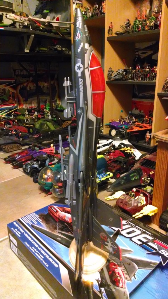 So I finally got around to doing this. I really liked that stand posted above from ebay but $40 was just too much. So I went to Lowes, picked up some supplies, and made my own. When I finally started working on this, It went together really quick and was pretty easy to do with the right tools. I will be up front, I have little experience with wood working. My quality of work is generally "good enough". You might not be able to see it in the pics but the rods that go in the engines are crooked. But when the plane is on top, you can't see that at all. If I end up doing another one, I will take some more time to not only make sure things are even, but to see if I can add that angle that the original display has. Still this was far cheaper to make, about $10. And even that price was high in my opinion. The base you see was about $8 by itself. It came like that, I didn't cut it at all. Pretty pricey for for what it is. I bet cheaper bases can be had at a craft store, I just didn't look. The rods are a 5/8" dowel rod. Find the right base and you can probably do these for $5 each. Or if you have the tools, cut the base yourself from standard lumber. (I don't have a router so...)