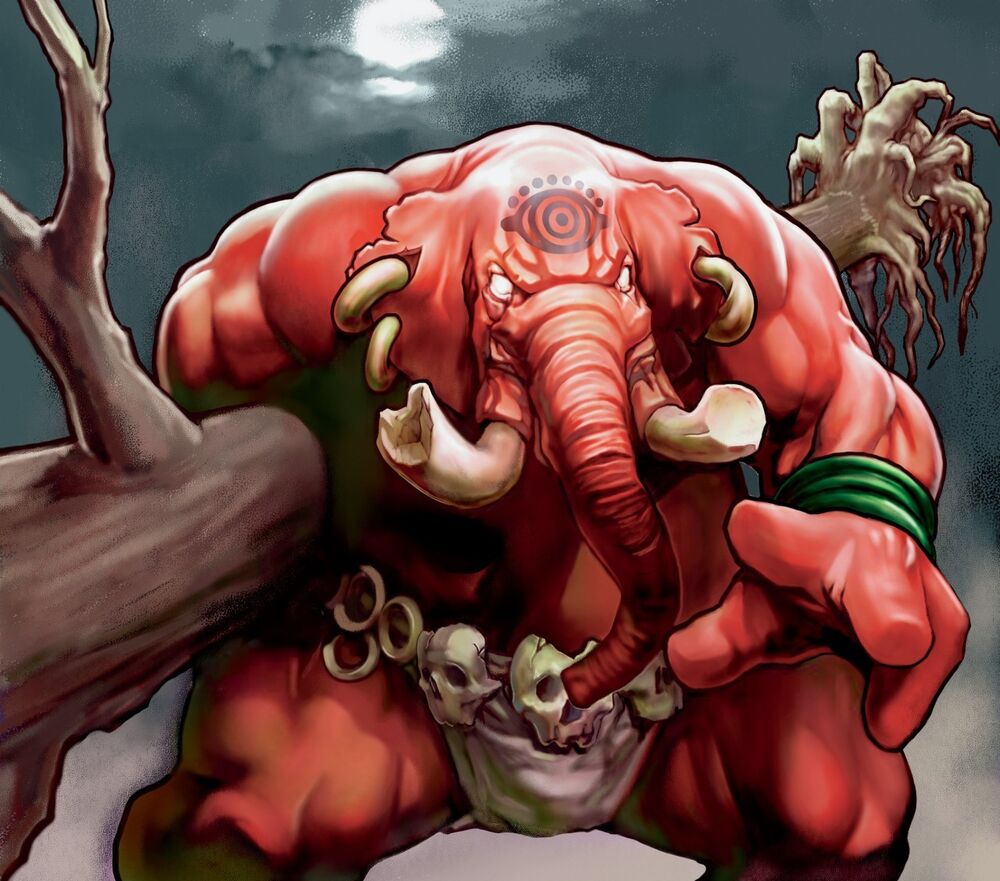 It appears to be a red elephant "god?" The hands are closed so its not supposed to hold anything. The metal bar sticking out connecting the lower left leg to the base...is odd. The leg is jointed but I can't get any movement from it.