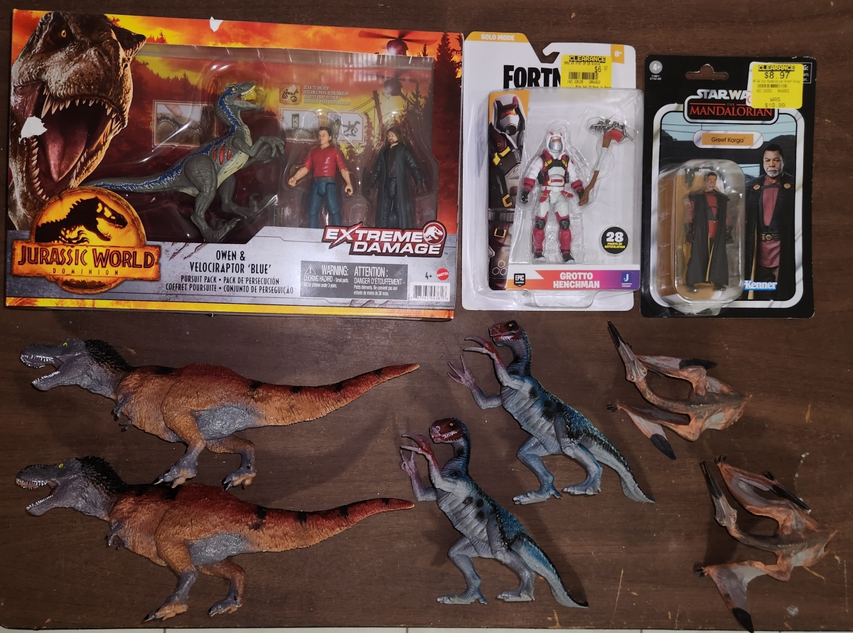 The vinyl dinos are high quality knock-offs of Safari Ltd. (Feathered T-Rex), Schleich (feathered Therizinosaurus) and Papo (pterosaur) and were only $2.99 each (originals go for $25-$35 depending on size). I bought all that they had of these figurines (the rest were really common species and knock-offs of lesser quality).